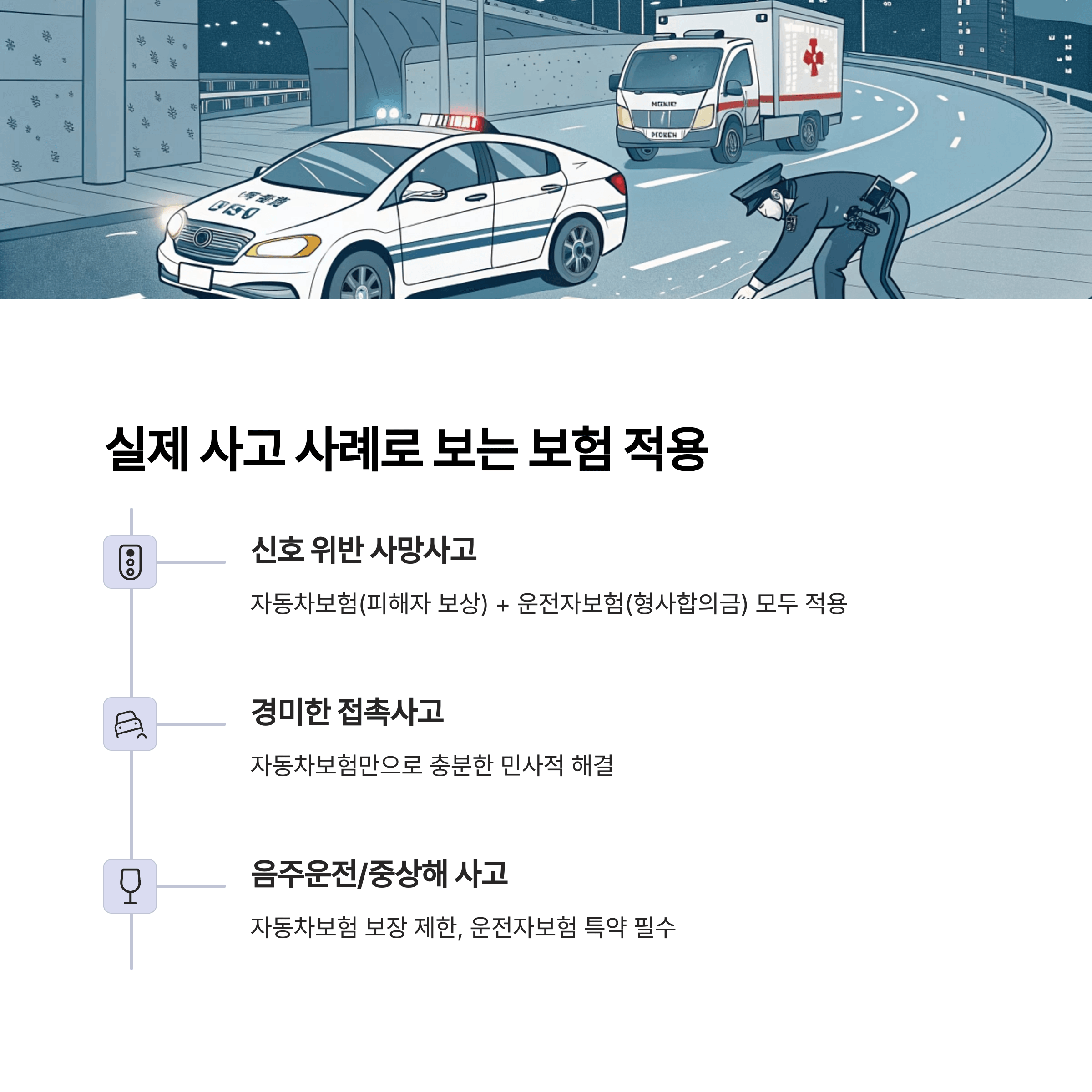 "실제 사고는 복잡합니다. 각 보험이 어떤 상황에 강한지 알아두세요."
